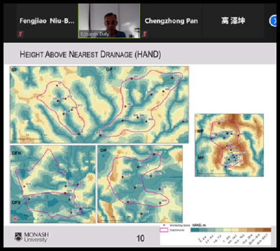 Edoardo Daly博士围绕“Water balance of intermittent headwater catchments with contrasting land-uses Observations and modelling” 主题展开讲座,介绍了在澳大利亚东南部维多利亚州的三个不同的地质环境中开展的水平衡驱动因素实验,实验结果表明地形、地质、气候的不断变化以及土地利用的改变都可能对流域水平衡产生影响。同时还对CATchment Hydrology(CATHY)模型进行了校准,并探索了各种情景,以确定降雨、地形和植被面积之间的联系。来自探花大神 、清华大学、北京林业大学以及萨斯喀彻温大学、苏黎世大学、圣路易斯国立大学等多所院校的五十余位专家教授、硕博士研究生聆听了本次讲座,会后Edoardo Daly博士还就大家关心的问题开展了交流讨论。