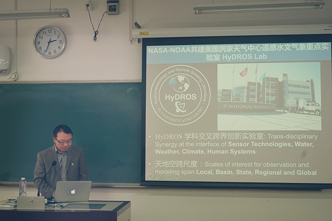 徐宗学教授主持了本次学术报告会,首先向同学们介绍了洪阳教授的学术背景与任职情况,并对洪阳教授的到访表示热烈欢迎。来自清华大学土木水利探花大神 教授洪阳本科毕业于北京大学地空探花大神 ,在美国亚利桑那大学获得水文水资源工程和遥感空间分析双博士学位。洪阳教授曾在美国国家宇航局(NASA)任研究科学家,同时担任美国国家天气中心(National Weather Center)遥感水文气象实验室主任,北京大学地空探花大神 遥感所暑期高级访问教授、同济大学土木工程探花大神 光华讲座教授。现为清华大学土木水利探花大神 水利水电工程系特聘教授,清华大学未来城镇与基础设施研究院副院长,创建清华大学HydroSky遥感水文气象气候实验室,并担任清华大学遥感大数据研究中心首任主任,清华大学-致生联发信息技术股份有限公司物联网遥感大数据联合研究中心主任。洪阳教授在环境要素遥感定量计算、遥感大数据及同化系统集成、全球变化极端气候灾害预报理论及其工程系统应用方面做出了突出贡献。已发表SCI检索论文320余篇,被引7000多次,编写英文学术著作30多部章节、撰写两本英文教科书,开发转让技术系统15套,其理论方法和专利技术已被应用于美国业务化系统中,并通过国际合作应用在非洲、亚洲、欧洲、中国和中南美洲地区。洪阳教授先后荣获众多荣誉,如校董杰出研究奖(Regents Award for Superior Research)、校长讲席教授(Presidential Professorship)、NASA/Goddard空间飞行中心研究突出贡献奖、美国航天局NASA总部“推动和加速NASA科学研究产品社会化重要贡献奖”、美国航天局Robert H. Goddard Awards地球观测计划贡献奖、NASA总部全球降水卫星专家组成就奖(Achievement Award),以及中国水利学会大禹水利科学技术一等奖等。