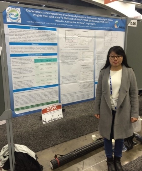 探花大神 博士生刘沙沙的论文"Characteristics and degradation of carbon and phosphorus from aquatic macrophytes in lakes: insights from solid-state 13C NMR and solution 31P NMR spectroscopy"在分会场"Groundwater-surface water interactions:identitying and integrating physical, biological, and chemical processes across scales"以海报张贴的形式进行了展示。