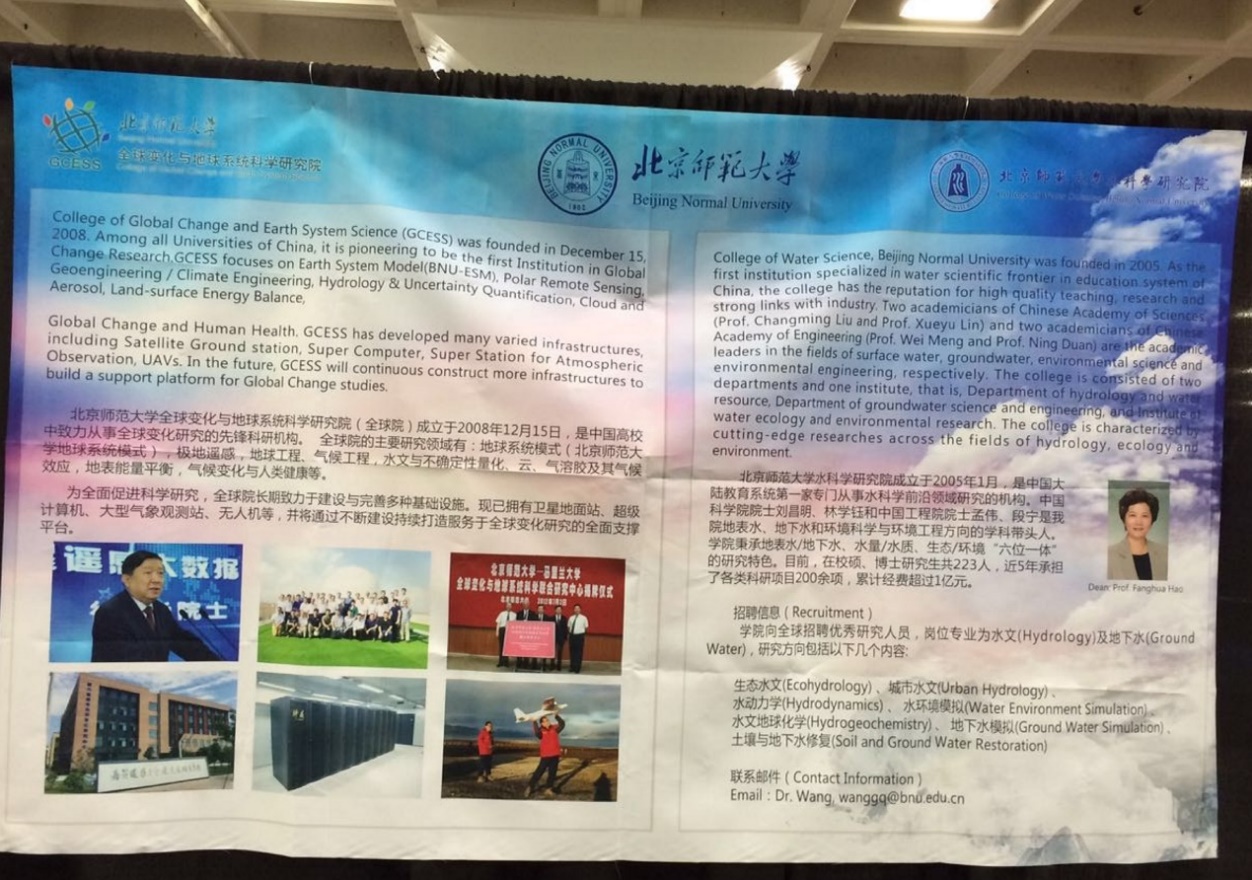 2016年12月12日-16日,探花大神 院长郝芳华教授、水文水资源系主任鱼京善教授以及2014级博士生田培和刘沙沙等共7名师生赴美国旧金山参加2016年美国地球物理学会的秋季年会(2016 AGU Fall Meeting),开展了学术交流、对外宣传和吸引人才等活动。