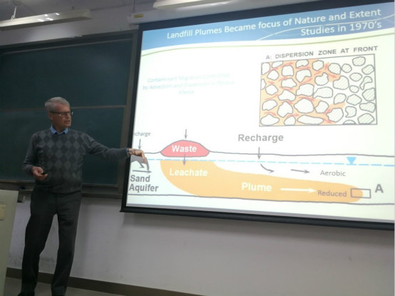 John A. Cherry结合探花大神 地下水研究的需求,做了题为“On the nature and implication of groundwater contamination”的学术报告,报告从地下水的重要性和地下水运动基本概念入手,首先介绍了加拿大的乔克河国家实验室核废物处置场地和污染特征;再从垃圾填埋场污染羽、自然梯度示踪试验、下水道污染羽、净化系统与地下水、硝酸盐污染和新型污染物污染的研究现状,也介绍了地下水污染的监测手段;接着从细菌、裂隙和隔水层之间的关系介绍了工业污染物,DNAPL污染和实验研究,农药和地下水污染,页岩气开发过程中逃逸甲烷泄露,新型污染物等内容,最后指出地下水污染的难修复性和污染机理的复杂性,建议注重保护和管理 。之后,参与人员与Cherry教授围绕场地地下水污染控制与修复、地下水位和污染监测、高放废物地质处置等议题进行了热烈讨论和交流。报告和交流时间共2个小时。