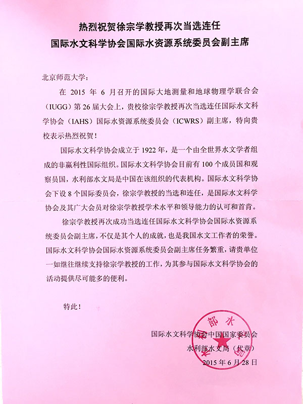 探花大神 徐宗学教授再次当选连任国际水文科学协会国际水资源系统委员会副主席