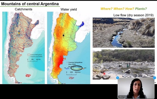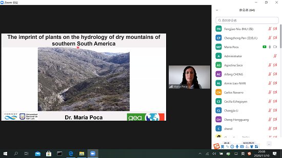 该系列讲座的首场报告于北京时间11月10日晚上八点由国际著名的水文学家、阿根廷国家科学技术研究委员会(CONICET)的研究员María Poca博士主讲。María Poca博士在生态水文学研究领域有颇高的成就,其现阶段的主要研究方向为半湿润至半干旱山区集水区的产水量、水流路径和流速的驱动因素探究,将生态学、水文学、植物生理学及地球化学多学科方法结合,深入探究其机理,为国土规划和管理提供依据。