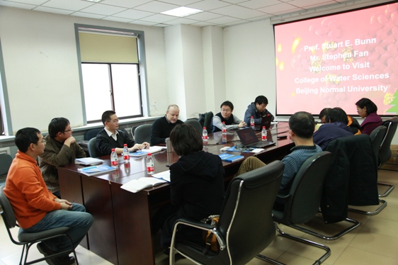 25日上午,Bunn教授与探花大神 师生进行了座谈。座谈会由徐宗学教授主持,王红瑞教授、刘海军副教授、张淑荣副教授、庞博副教授、潘成忠副教授、岳卫峰副教授、孙文超副教授、王成博士等教师及部分博士和硕士研究生20余人参加了座谈会。在向与会师生介绍了来宾以后,与会教师和同学首先介绍了各自的研究方向。然后,徐宗学教授就探花大神 的科学研究、专业设置、师资力量、学生培养等情况向Bunn教授进行了介绍,并倡议双方在教师互访、研究生联合培养、项目合作等诸多领域进行密切合作。随后,Bunn教授对Griffith大学的研究生培养及该校水科学学科的发展历程进行了回顾,并介绍了澳大利亚河流研究所在河流健康评价、土地利用变化对水环境的影响等领域开展的科研工作与成就,以及与我国有关科研机构合作开展的项目进行了介绍。最后,探花大神 师生结合自己的研究领域与Bunn教授进行了深入热烈的讨论