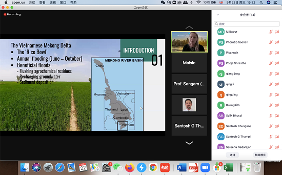 会议共分为四场,上午两场主要探讨了“与水文循环有关的气候变化模型”与“极端气候对水资源和生态系统的影响”;下午两场对“水资源与生态系统的相互作用”和“变化环境中生态系统退化的风险评估”进行了详细讨论。本次会议共有26人进行发言,每人发言时间为20分钟,每场约有70余名师生参与会议。会议过程中,演讲者与参会者互动频繁,线上气氛热烈。Prof. Sangam和吴劲教授在所有演讲者汇报结束后主持了问答环节,并请专家针对问题进行解答。会议最后,Sangam教授、周玉良教授和吴劲教授对会议进行了总结讲话。至此,会议圆满结束。