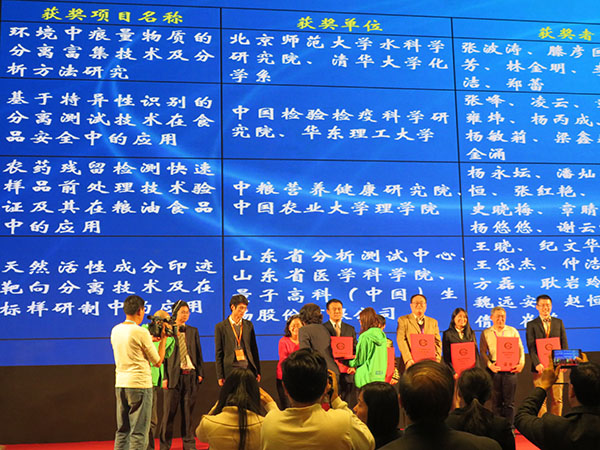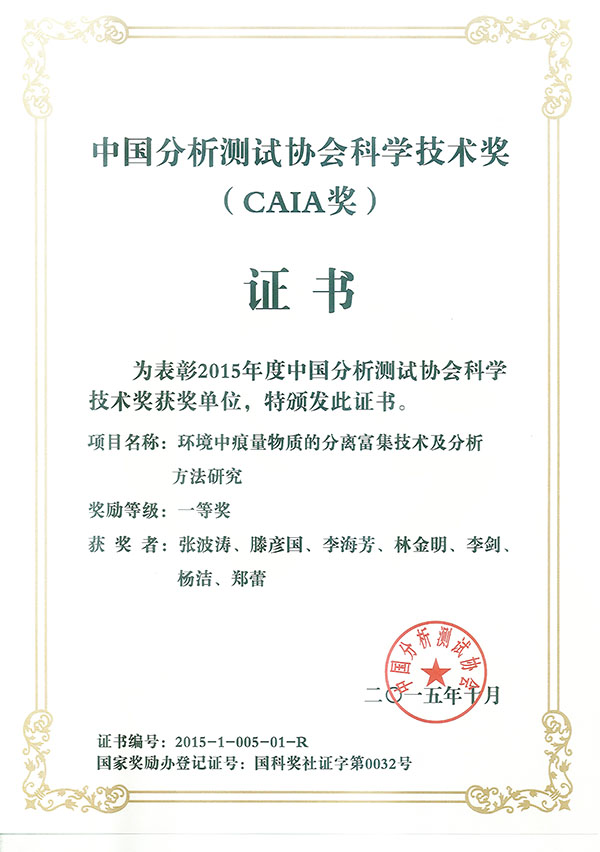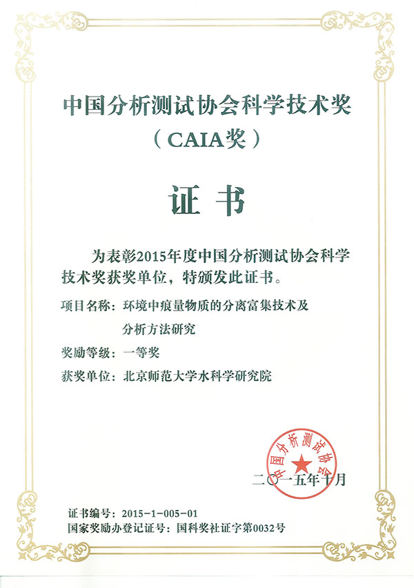 2015年10月27日下午,中国分析测试协会科学技术奖颁奖仪式在国家会议中心隆重举行。由探花大神 教师张波涛、滕彦国、李剑、杨洁、郑蕾和清华大学化学系教师李海芳、林金明等负责研究的“环境中痕量物质的分离富集技术及分析方法研究”成果荣获2015年中国分析测试协会科学技术奖一等奖。